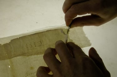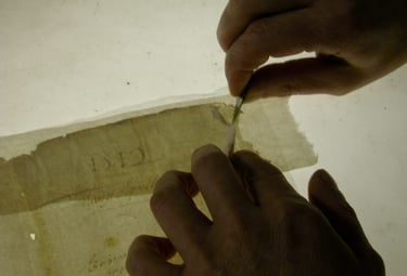 Trattamenti di reintegro delle lacune e consolidamento dei supporti cartacei mediante tecnologia leafcasting, particolarmente indicati in presenza di danni estesi o attacchi entomologici.